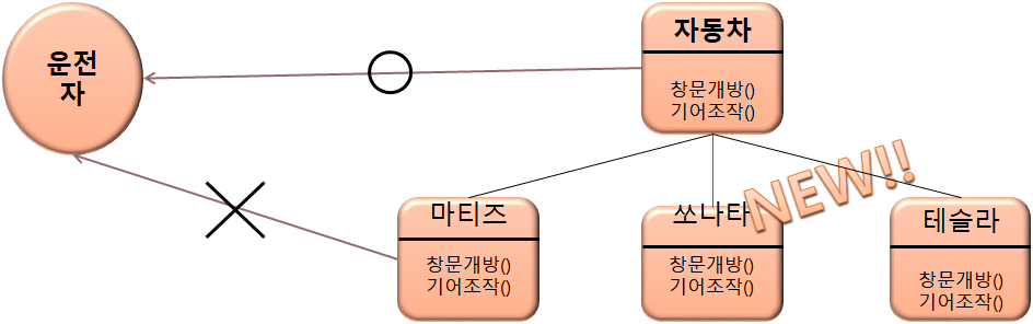 상위클래스 또는 인터페이스를 중간에 둠으로써 다양한 자동차가 생긴다고 해도 객체지향세계의 운전자는 운전습관에 영향을 받지 않게 됩니다. 자동차 입장에서는 자신의 확장에는 개방돼 있는 것이고, 운전자 입장에서는 주변의 변화에 폐쇄돼 있는 것이됩니다.