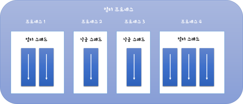 멀티 태스킹은 두 가지 이상의 작업을 동시에 처리하는 것을 말한다. 운영체제는 멀티 태스킹을 할 수 있도록 CPU 및 메모리자원을 프로세스마다 적절히 할당해주고, 병렬로 실행시킨다. 멀티 프로세스가 애플리케이션 단위의 멀티 태스킹이라면 멀티 스레드는 애플리케이션 내부의 멀티 태스킹이라고 볼 수 있다.