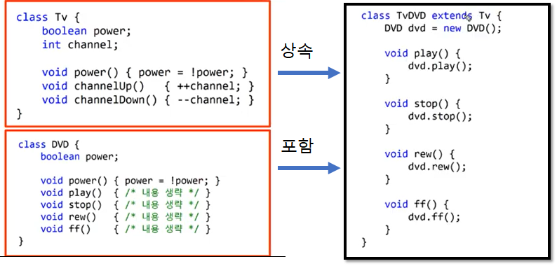 TvDVD 클래스는 Tv를 상속한다. DVD 클래스는 객체를 생성하고 메서드 선언을 하여 사용을 하게 한다. 이렇게 하면 다중상속과 같은 효과를 나타낼 수 있게 된다.