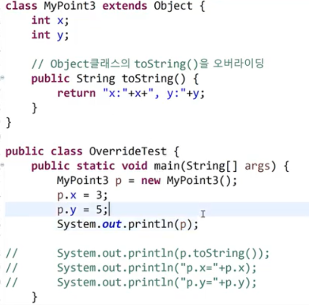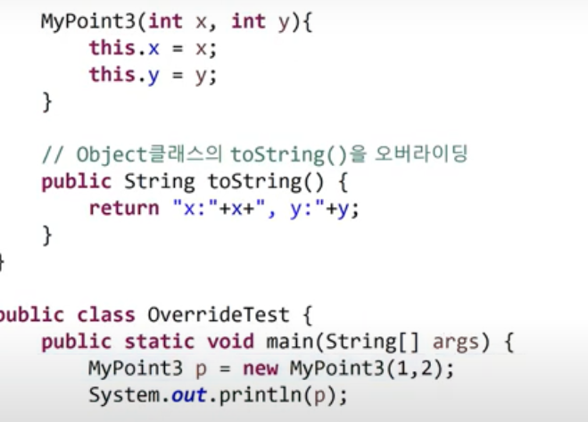오버라이딩 메서드를 선언할 때 주의할점은 선언부는 그대로 써야한다. 변경이 불가능하며 내용만 변경을 한다.
