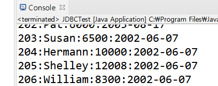 System.out.println(emp_id + ":" + f_name + ":" + sal + ":" + hireDt);