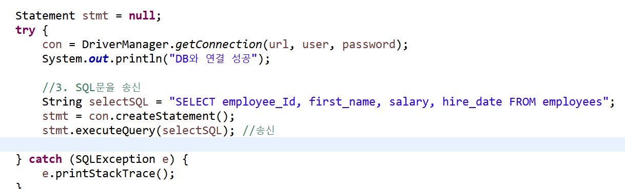 stmt.executeQuery(selectSQL); 으로 송신을 하였다.