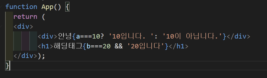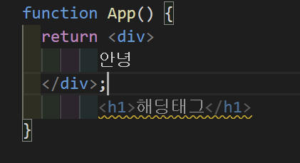 또 주의해야할 점이 하나의 태그안에 코드를 넣는다고 하더라도 리턴이 두개 이상이 되면 에러가 발생한다. 즉, 리턴시에 하나의 DOM만 리턴할 수 있다.