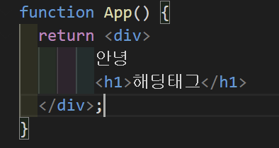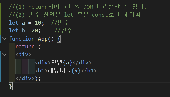 또 주의해야할 점이 하나의 태그안에 코드를 넣는다고 하더라도 리턴이 두개 이상이 되면 에러가 발생한다. 즉, 리턴시에 하나의 DOM만 리턴할 수 있다.