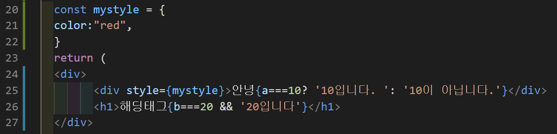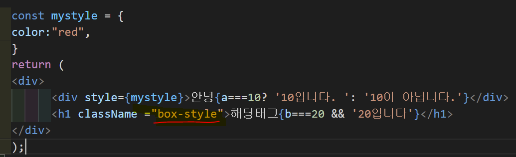 JSX 사용하기 위해서 중괄호를 넣는 것이며 const mystyle 변수를 안에 넣어서 사용한다.