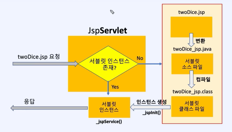 - jsp요청 -> 인스턴스 존재하는지 확인 -> No -> 기존의 jsp 파일을 서블릿으로 변환 -> 컴파일하여 클래스 파일