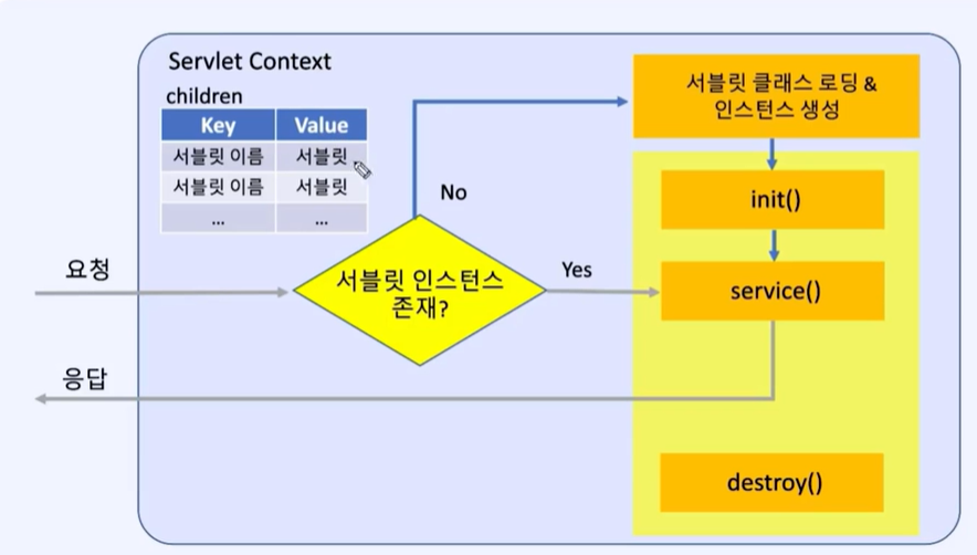 - no -> 서블릿 클래스로딩 & 인스턴스 생성 -> 초기화 init() -> service() 호출