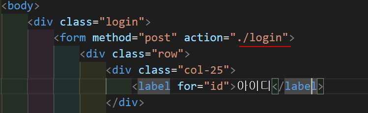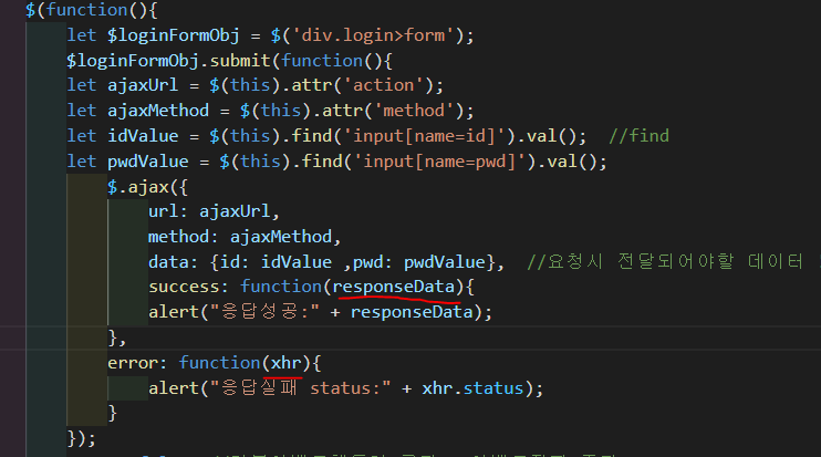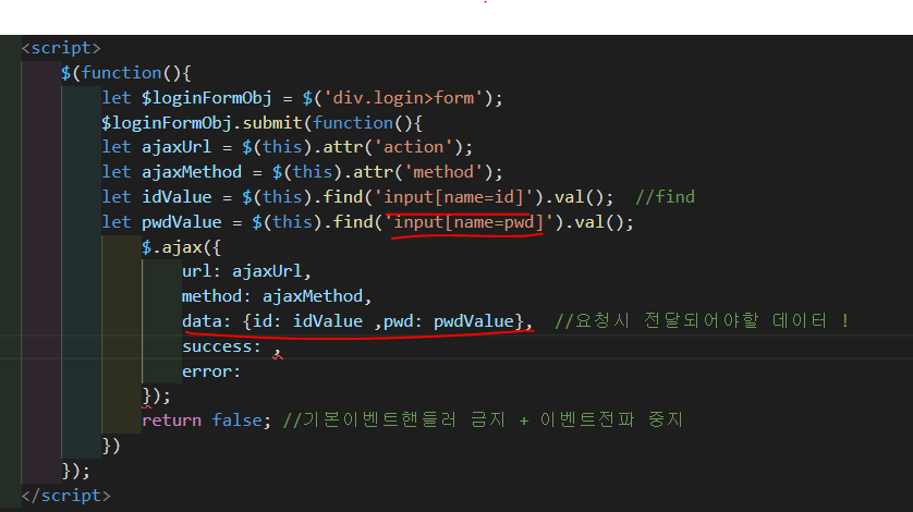 순서대로 보면 form이 포함하고 있는 것의 객체(loginFormObj) 를 만들고 클릭이 되면 이벤트가 처리되게 하는데 action = ".login" 속성을 ajaxUrl에 담아 ajax 에 정의하였다. 그 외의 것들도 같은 방식으로 표현을 하도록 하겠다. data 값에는 id와 pwd가 들어있다. find() - 후손객체를 찾는다. input 요소중에 name 속성이 id 인 것을 찾아 val() 메서드를 사용하여 아이디 입력란에 입력된 값을 얻어 올 수 있다. pwd도 동일하게 적용한다.