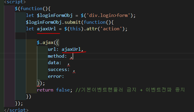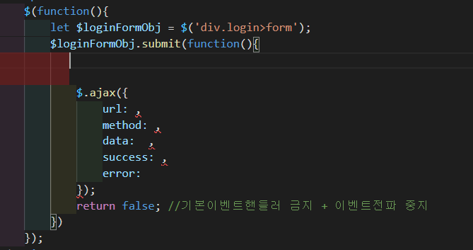 사용자가 버튼을 눌렀을 때만 이벤트가 발생해야 되기 떄문에 기본 이벤트 핸들러를 막아야한다. form의 객체를 얻고 그 값을 loginFormObj 변수에 담는다. submit 이벤트가 발생했을 때 리턴값을 false로 하여 이벤트 헨들러를 금지한다. 현재는 로그인버튼을 눌러도 아무 반응이 없다.