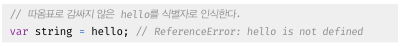 만약 문자열을 따옴표로 감싸지 않으면 자바스크립트 엔진은 키워드나 식별자 같은 토큰으로 인식한다.