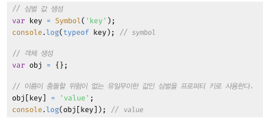 ES6에서 추가된 7번째 타입이다. 변경 불가능한 원시 타입의 값이다. 심벌값은 다른 값과 중복되지 않은 유일무의한 값이다. 따라서 주로 이름이 충돌할 위험이 없는 객체의 유일한 프로퍼티 키를 만들기 위해 사용한다.