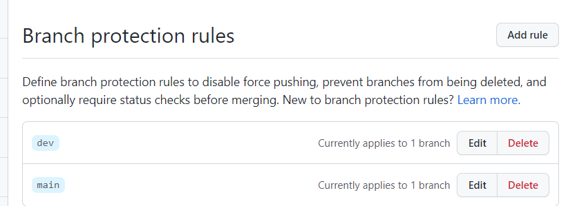 Settings -> branches -> main : add rule -> Require a pull request before mergingWhen enabled, all commits must be made - 승인을 해야 적용이 됨 - 아무나 push를 못하기 때문에 보호받는 브런치 main이 된다.