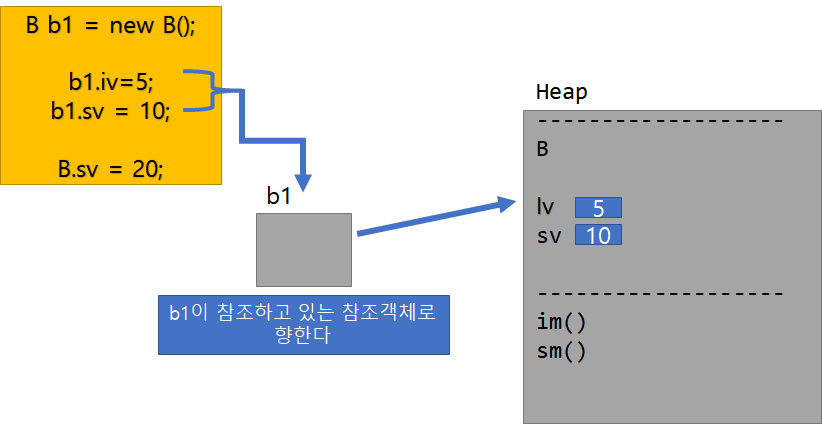위 그림에서 파랑선을 보게되면, 객체를 생성하고 stack에는 b1 , Heap안에는 B 적재된다.