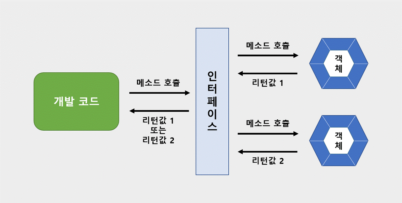 개발 코드와 객체가 서로 통신하는 접점 역할을 한다. 개발 코드가 인터페이스의 메서드를 호출하면 인터페이스는 객체의 메서드를 호출한다. 그렇기 때문에 개발 코드는 객체의 내부 구조를 알 필요가 없고 인터페이스의 메서드만 알고 있으면 된다.