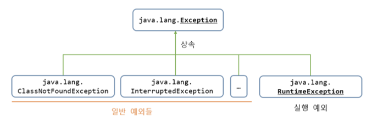 예외는 두 가지 종류가 있다. 하나는 일반예외(Exception) 이고, 다른 하나는 실행 예외( Runtime Exception)이다.