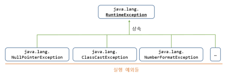 실행예외는 자바 컴파일러가 체크하지 않기 때문에 오로지 개발자의 경험에 의해서 예외 처리 코드를 삽입해야한다.