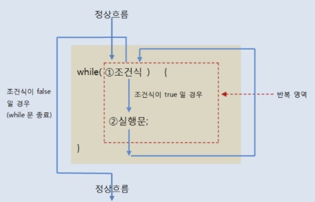 for문이 정해진 횟수만큼 반복한다면, while문은 조건식이 true일 경우에 계속해서 반복한다. 조건식이 false가 되면 반복행위를 멈추고 while문을 종료한다.