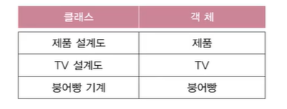 클래스는 제품설계도, TV설계도, 붕어빵 기계라고 볼 수 있다 객체는 제품, TV, 붕어빵과 같다.