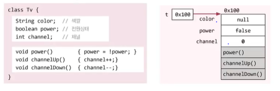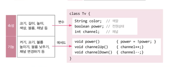 속성을 변수로 기능을 메서드로 정의하면 TV클래스가 만들어 진다.