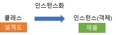 제품을 만들기 위해 설계도(클래스)를 작성한다 .사용을 할 수 있게 인스턴스화하여 제품을 만든다.